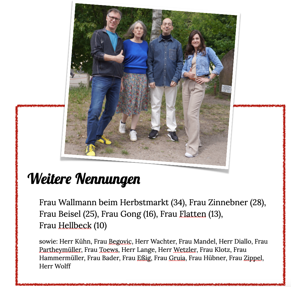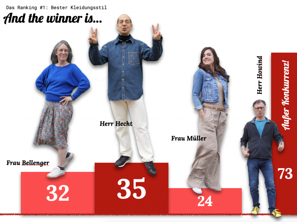 Dem Gewinner unserer ersten Umfrage, Herrn Dr. Christoph Hecht, gratuliert die Redaktion mit einer kräftigen Fanfare ganz herzlich. Er konnte 35 Stimmen einsammeln und darf sich fortan offiziell als bestgekleideter Lehrer bezeichnen. Den zweiten Platz holt Madame Florence Bellenger mit 32 Stimmen. Nous lui adressons également toutes nos félicitations! With 24 votes, we sing a congratulatory song for Miss Stephanie Müller, who came in third place! Außer Konkurrenz haben wir den offensichtlich auch kleidungstechnisch sehr beliebten Dr. Jochen Howind gesetzt. Er konnte zwar satte 73 Stimmen für sich gewinnen, mehr als doppelt so viele wie unser erster Platz. Jedoch vermuten wir aufgrund des großen Abstands zu den anderen Nominierten und seinem kometenhaften Aufstieg innerhalb nur einer Stunde, dass unser System gehackt wurde. Entschuldigung, Herr Howind, fair ist fair!